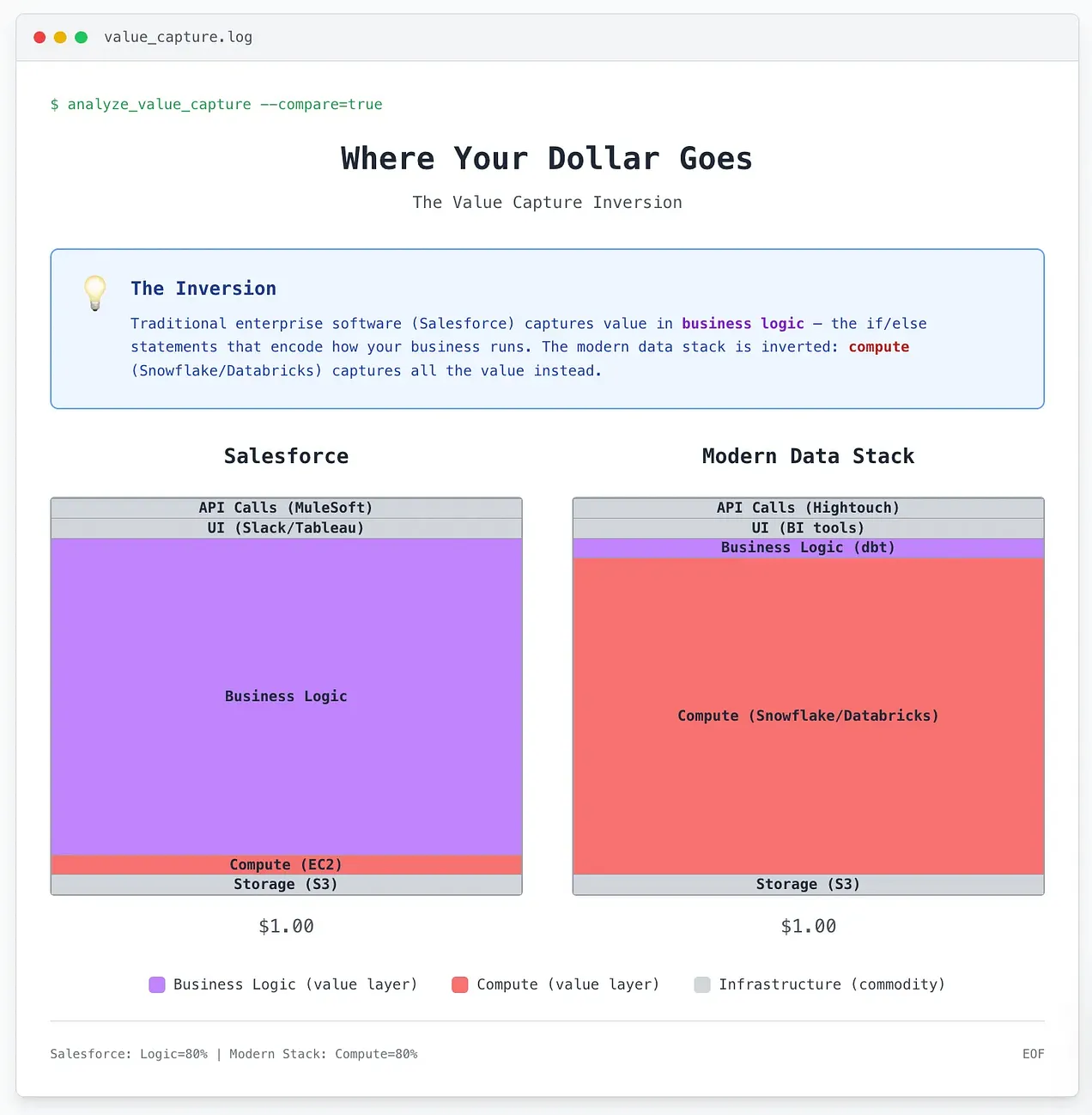 "dbt์ 1๋ฌ๋ฌ๊ฐ ์ฐ์ผ ๋๋ง๋ค Snowflake์๋ 10๋ฌ๋ฌ๊ฐ ๋ค์ด๊ฐ๋๋ค. ์๋ง์ Snowflake ์์ ๋ด๋น์๋ค์ dbt๊ฐ ์ต๊ทผ ๋งค์ถ 1์ต ๋ฌ๋ฌ๋ฅผ ๋๊ฒผ์ ๋ฟ์ด์ง๋ง, Snowflake ๋น์ฉ์ผ๋ก๋ 5์ต ๋ฌ๋ฌ๋ฅผ ๋ฐ์์ํค๊ณ ์๋ค๊ณ ํ์ธํด ์ฃผ์์ต๋๋ค. ๊ทธ๋์ Snowflake ๋ด๋น์๋ค์ ๋ชจ๋ ๊ฑฐ๋์์ dbt๋ฅผ ํจ๊ป ํ๋ ๊ฒ์ ์ข์ํฉ๋๋ค. ์ด๋ dbt ์ปค๋ฎค๋ํฐ๊ฐ ์์ฒญ๋๊ฒ ์ฑ์ฅํ๋ ๊ณ๊ธฐ๊ฐ ๋์์ต๋๋ค. ์ฆ, Snowflake ์์ ๋ด๋น์๋ค์ด ์ฌ์ค์ dbt์ ์์๋ฃ ์๋ ์์ ํ์ด์๋ ์ ์ ๋๋ค. ๋์ ๋๋๋ ๋์ dbt๊ฐ 2%๋ฅผ ๊ฐ๊ณ Snowflake๊ฐ 98%๋ฅผ ๊ฐ์ก๋ค๋ ์ ๋ง ๋นผ๋ฉด์. ์์ฃผ ๊ด๋ํ ํํธ๋์ญ ๊ตฌ์กฐ์ฃ ."